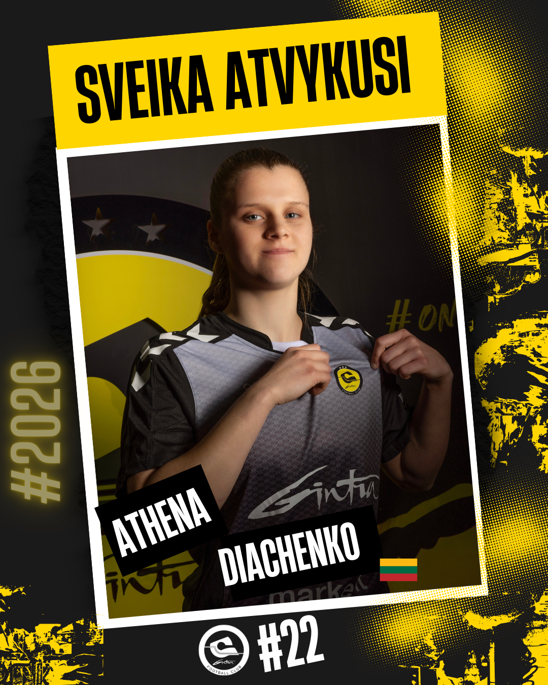Komplektacijos darbus tęsianti Lietuvos čempionė Šiaulių „Gintra“ pristato dar vieną sudėties pastiprinimą 2026 metų sezonui. Prie geltonai juodų jungiasi iš Anglijos į Lietuvą sugrįžtanti futbolininkė Athena Diachenko, kuri save pristato Atėnės vardu. 19 metų gynėjos pozicijoje rungtyniaujanti žaidėja vilkės 22-uoju numeriu pažymėtus marškinėlius.