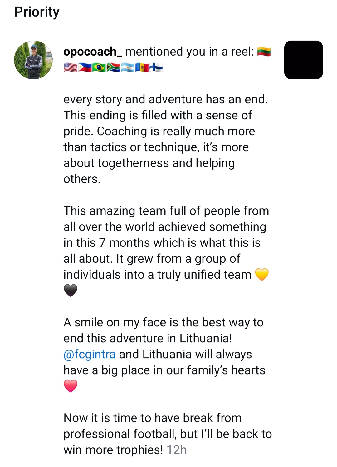 „Kiekviena istorija ir nuotykis turi savo pabaigą. Ši pabaiga kupina pasididžiavimo jausmo. Treniravimas yra tikrai daug daugiau nei taktika ar technika, tai yra daugiau apie bendrystę ir pagalbą kitiems. Ši nuostabi komanda, pilna žmonių iš viso pasaulio, sugebėjo šį bei tą pasiekti per šiuos 7 mėnesius ir tai yra būtent apie tai. Iš asmenų grupės ji išaugo į tikrai vieningą komandą. Šypsena mano veide – geriausias būdas užbaigti šį nuotykį Lietuvoje. „Gintra“ ir Lietuva visada užims didelę vietą mūsų šeimos širdyse. Dabar atėjo laikas pailsėti nuo profesionalaus futbolo, bet aš grįšiu laimėti daugiau trofėjų“, – atsisveikinimo žinutėje rašė Opo.
